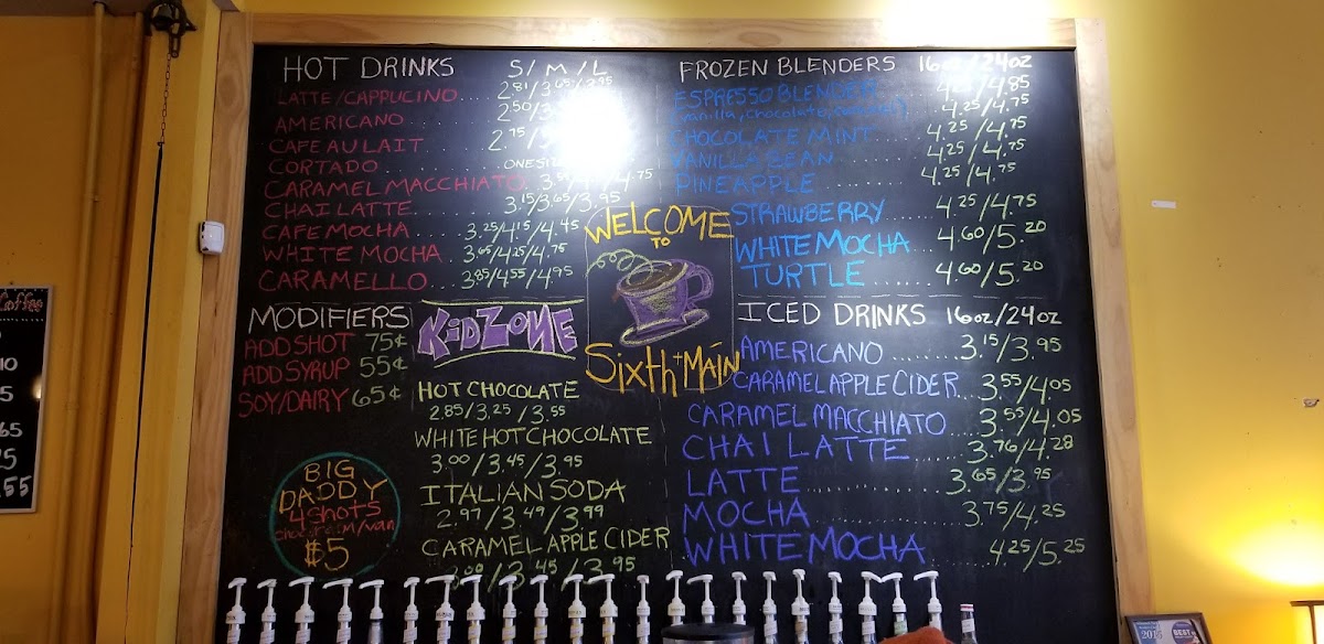 Sixth & Main Coffeehouse Inc. in Shelbyville offers a simple yet delightful menu that caters to both those who enjoy a refreshing cold drink and those who prefer a warm beverage. The cold drinks section includes Iced Tea, which provides a crisp, refreshing option for those seeking a lighter taste. The Iced Latte is another favorite, offering a smooth blend of espresso and cold milk, perfect for those who want their coffee served cold. For those with a sweeter tooth, the Iced White Mocha is a great choice, with its rich, creamy texture and a gentle balance of espresso and white chocolate.